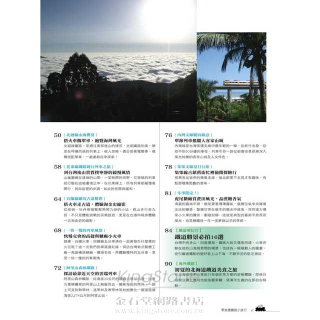 台灣中央多山,四面環海,鐵路大致又環島而建,如果搭火車出遊,透過車窗常可欣賞如畫的山海風光,美不勝收。其實火車奔馳在這些山海風景間的場景,也是一幅幅動人的圖畫,吸引鐵道攝影的愛好者上山下海,不辭辛苦的駐足捕捉。特選20個台灣鐵路最具代表性的「山海絕景」,涵蓋了高鐵、台鐵、糖鐵及林鐵,看看各路火車在不同地理特色的風景中奔馳。並告訴讀者如何到達,如何拍攝,輕鬆成為鐵道攝影達人。