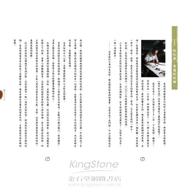 用這樣的心情來寫它,應該是我最能做到的事情吧。我是這麼想的,我既是從這裡出發,對於這個城裡,我卻也是一個旅人,我既是在這裡長大,卻也在台北茁壯,一個人走到某個階段總是會了解該為曾經哺育過自己的人回應些什麼,於是,這時候,適時的,筆就揚起,把我對於故鄉的記憶,重新拾起,重新組合,過去與現代融合成我對台南的感情,就像如今形成的我。