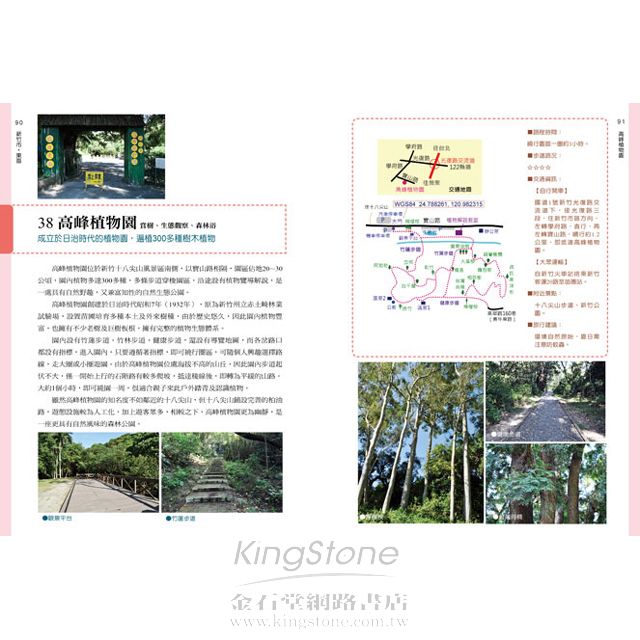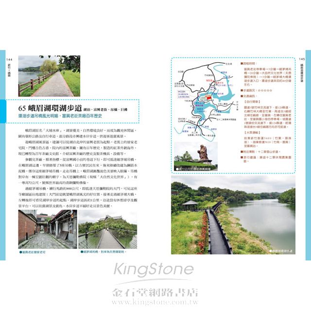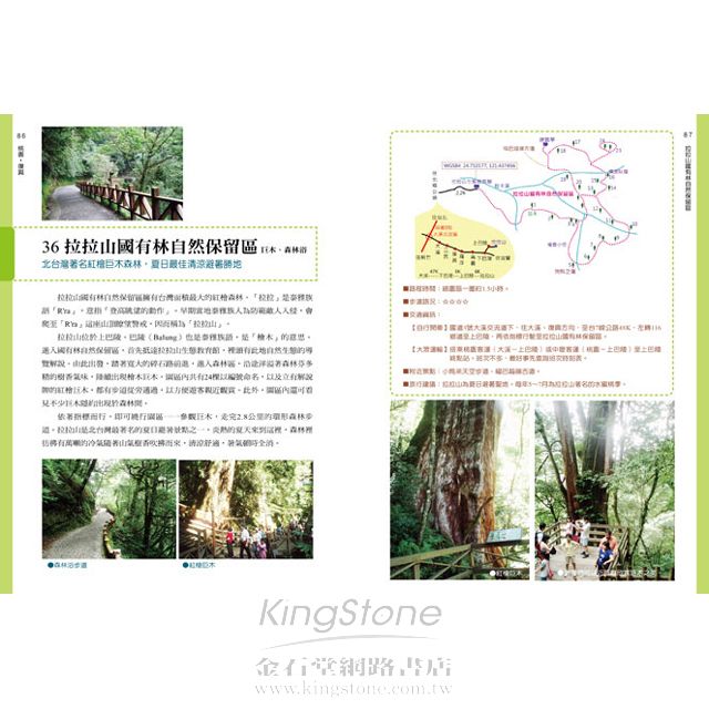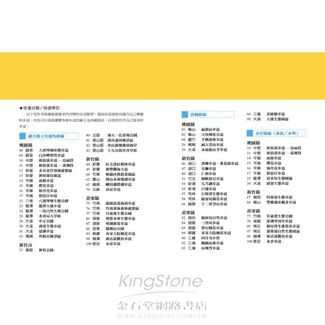 作者並將100條步道依各種需求分類規劃為:●適合親子出遊的路線●賞桐路線●水岸路線(溪流/水圳)●湖泊路線(水庫/埤塘)●觀海路線●森林浴路線●登山健行路線●農業休閒園區●特殊景觀路線●單車路線●作者推薦的10條熱門步道-------讀者可以快速索引所需的步道資訊。