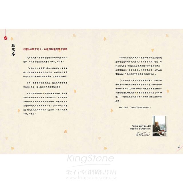 《日本回遊》還有一個值得推薦的魅力,在於其中蘊含著日方所抱持著對台灣人感謝的心意,由台灣的帕斯頓和日本的GLOBAL DAILY兩大團隊攜手製作出一本重視視覺感的旅遊書。請各位讀者務必帶著《日本回遊》,一同前往東京地區回遊,我們誠心地在東京等待大家。