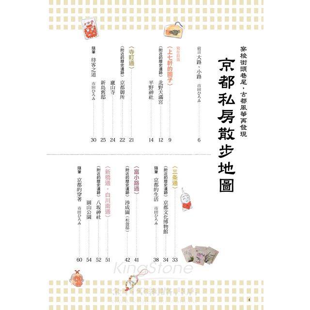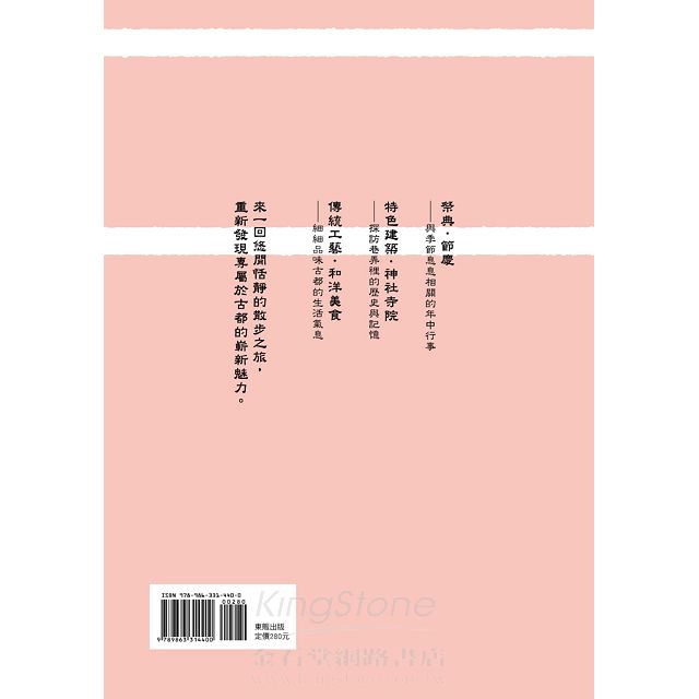 如果你已經到過京都、被京都蘊含的傳統與美所吸引,那請務必再次跟著本書,進行一回巷弄間的京都發現之旅,你會發現,京都很適合散步,處處充滿驚喜,充滿不可思議;如果你不曾到過京都,相信你能透過本書,深深感受到有別於熱門觀光景點、最貼近京都生活的風貌。