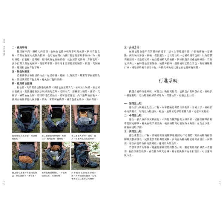 本書分為10章,涵蓋裝備規劃、衣著穿搭、野外炊事、行進技巧、地圖判讀,以及緊急處置等技能。作者藉由傳遞真正關鍵的觀念,協助讀者找出能彈性安排的空間,形塑屬於自己的登山風格。