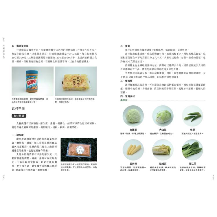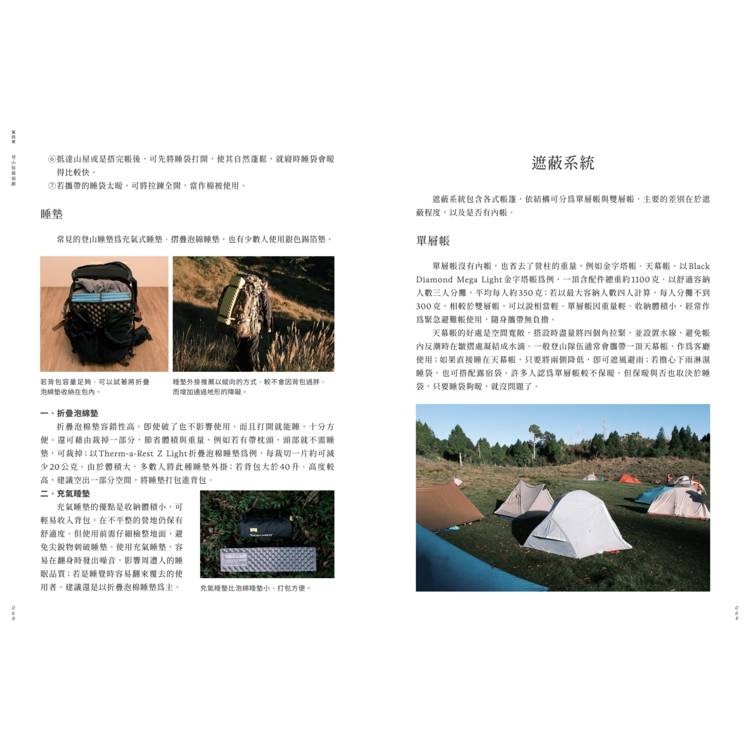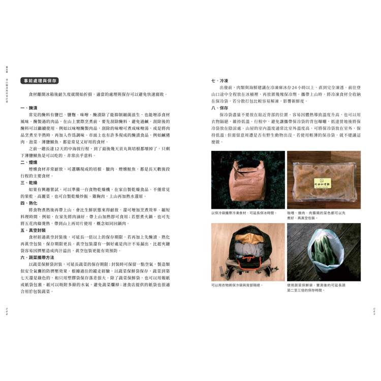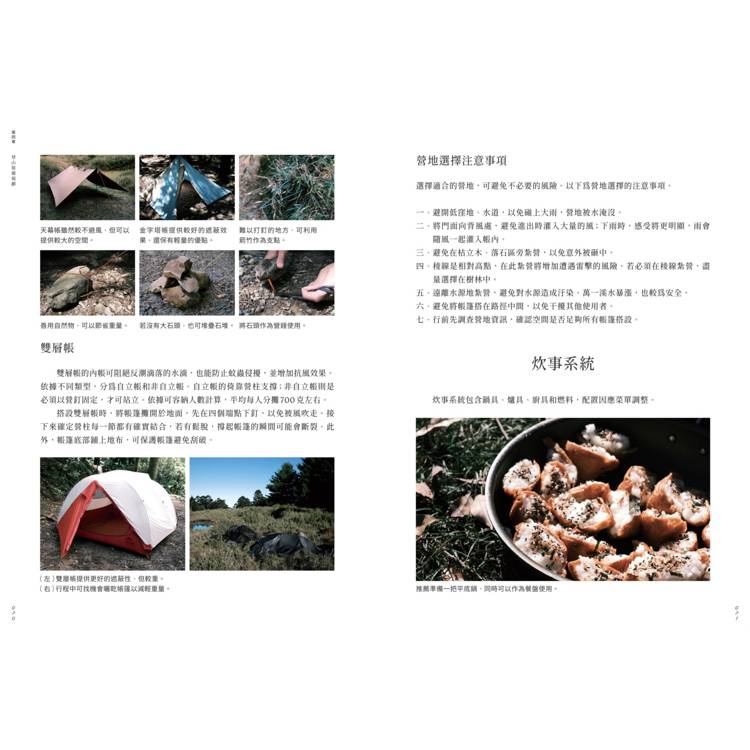 本書分為10章,涵蓋裝備規劃、糧食規劃、野外炊事、行進技巧、地圖判讀、以及風險管理、行程計畫方法、緊急應變與處置、無痕山林等。我加入許多帶隊時的觀察與實務經驗,在解說基本技能之餘,也試圖將理論更貼近實際會碰上的狀況。
