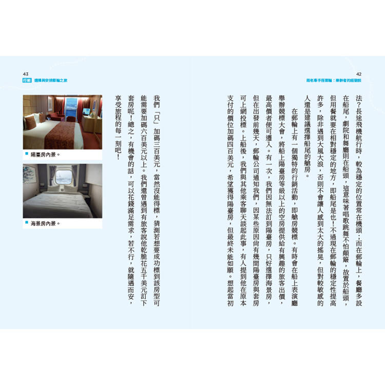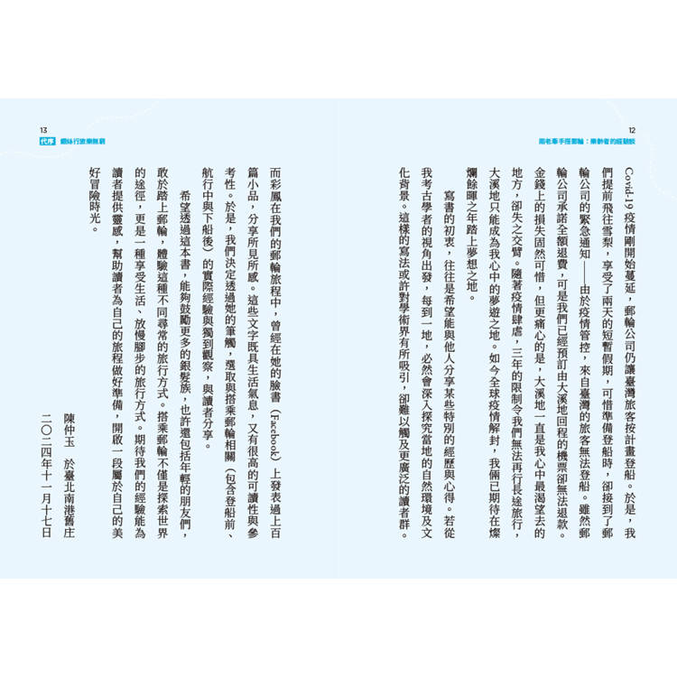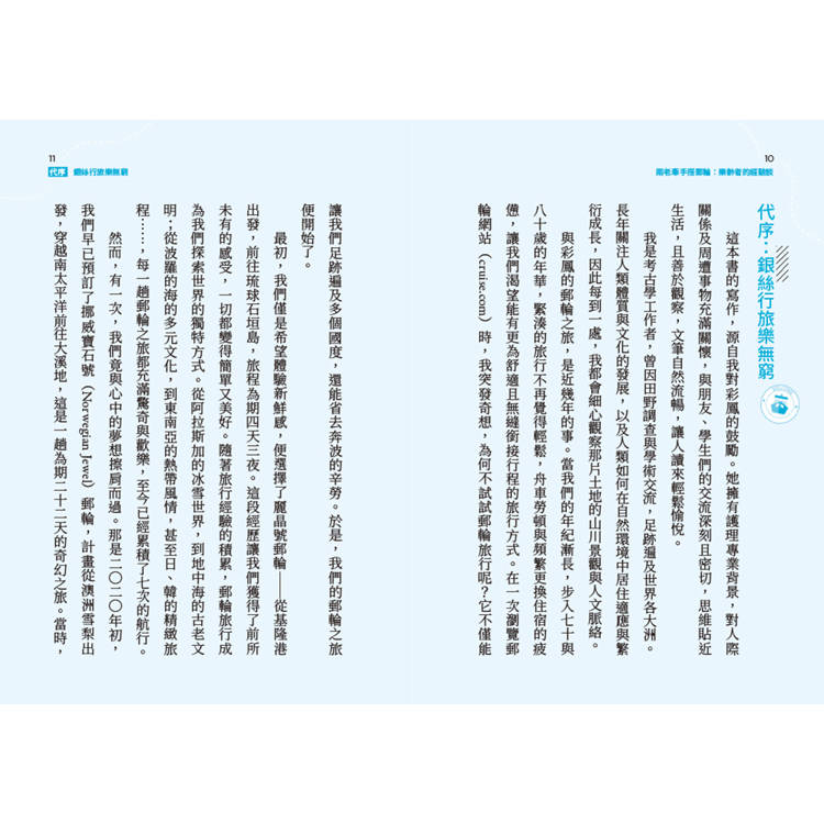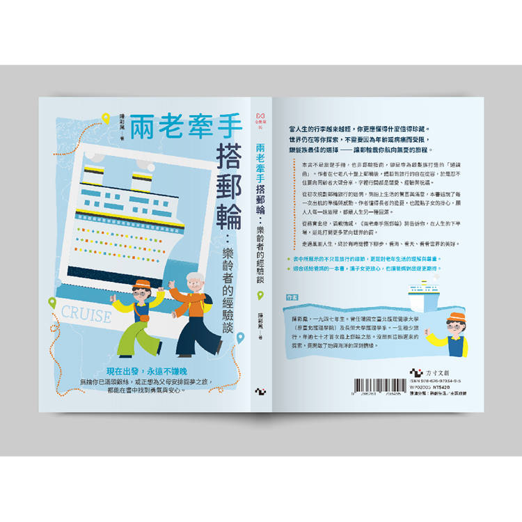 在書中,陳彩鳳以豐富的人生閱歷,細膩描繪郵輪旅途的點滴,分享一場場悠然自在的銀絲行旅。這不僅是一趟趟旅行的經驗談,更是一場場關於歲月、陪伴與探索的生命對話,也是對尚未啟航之樂齡長者的鼓舞勉勵。