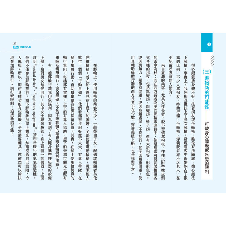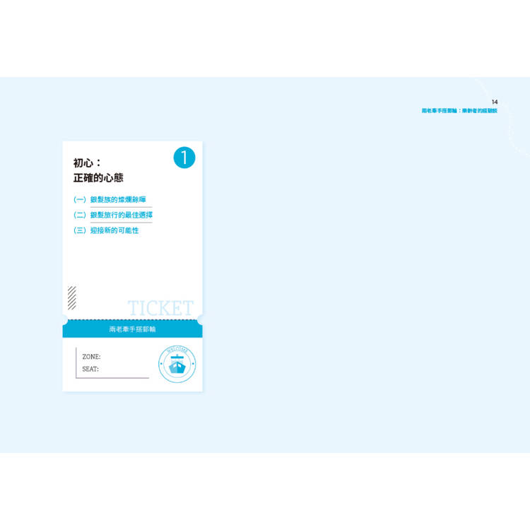 本書不是旅遊手冊,也非郵輪指南,卻是專為銀髮族打造的「邀請函」。作者在七老八十登上郵輪後,體驗到旅行的自在從容,於是忍不住要向同齡者大聲分享。字裡行間都是關愛、經驗與祝福。