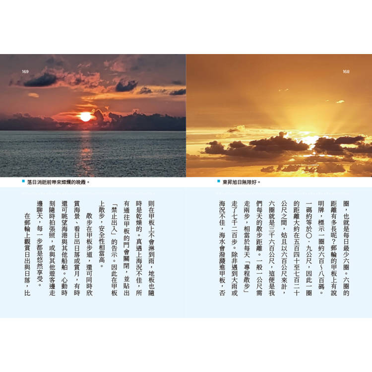 在郵輪航行期間,除了用餐,我們每天也會到甲板的步道上散步。一般郵輪的第五層和第六層之間,以及最頂層的外圍甲板,都設有完全開放的步道,旅客可以在這裡散步,甚至慢跑。我們通常一天走兩次,每次三圈,也就是每日最少六圈。六圈的距離有多長呢?郵輪的甲板上有說明牌,標示一圈約六百~八百碼。一碼約等於〇.九公尺,因此一圈的距離大約在五百四十至七百二十公尺之間,姑且以六百公尺來計,六圈就是三千六百公尺,這便是我們每天的散步距離。一般一公尺需走兩步,相當於每天「專程散步」走了七千二百步。除非遇到大雨或海況不佳,海水會潑濺進甲板,否則在甲板上不會淋到雨,地板也隨時是乾燥的。真遇上海況不佳,所有通往甲板的門會關閉,並貼出「禁止出入」的告示。因此在甲板上散步,安全性相當高。