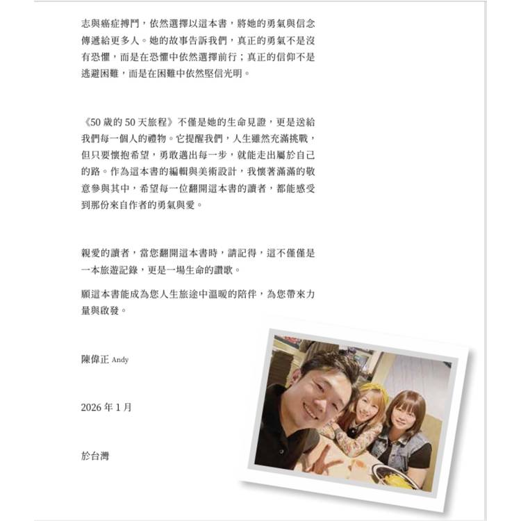 《50歲的50天旅程》不僅是她的生命見證,更是送給 我們每一個人的禮物。它提醒我們,人生雖然充滿挑戰, 但只要懷抱希望,勇敢邁出每一步,就能走出屬於自己 的路。作為這本書的編輯與美術設計,我懷著滿滿的敬 意參與其中,希望每一位翻開這本書的讀者,都能感受 到那份來自作者的勇氣與愛。
