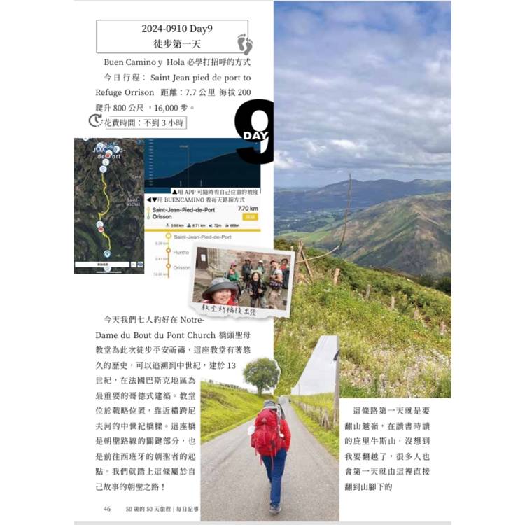 儘管無法與她一同踏上那條漫長的朝聖之路,但我以另 一種方式參與其中,幫助她將這段生命旅程化為一本書。 在書中,她記錄了每一天的腳步、每一段風景,以及每 一次與自己內心的對話。這不僅是一場徒步的挑戰,更 是一場心靈的淬鍊,一次與命運的和解。