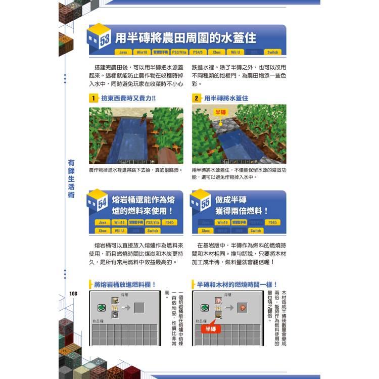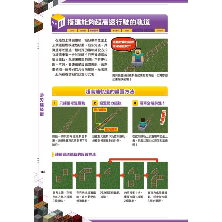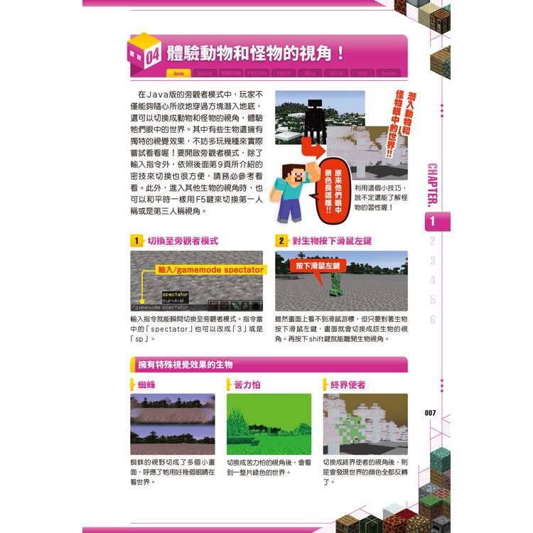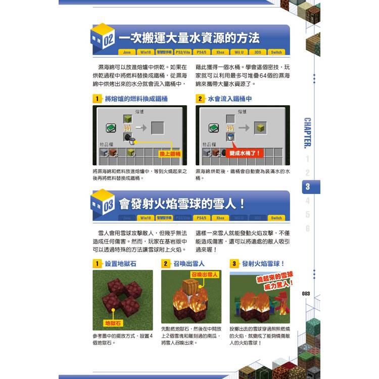 建築黑科技:想蓋秘密基地?你可以學會利用「書本位置」啟動的隱藏門,或是利用粉雪製作只有你知道的隱藏通道,讓你的寶藏絕對不會被朋友發現。 甚至連「即使在陸地上也能獲得海靈祝福」這種違背常理的神奇技巧,這本書都幫你準備好了!