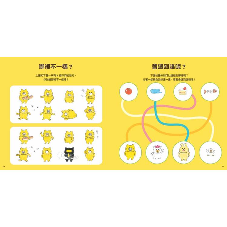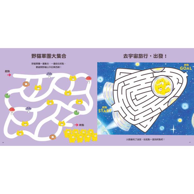 陪小小野貓迷看看每一頁可愛有趣的情境圖,想一想、找一找、數一數、連一連、拼拼圖、走迷宮……