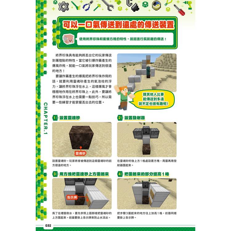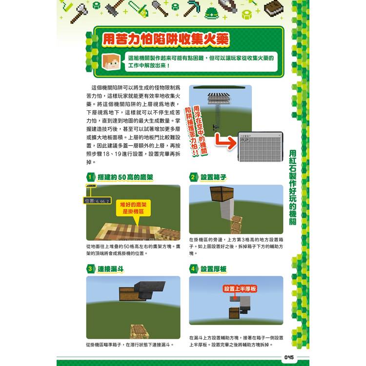 【紅石機關篇】實體裝置的大進化! 教你建造破壞力十足的「連射型TNT加農砲」、讓資源源源不絕的「全自動物品分類機」,甚至還有能調整時間間隔的「連閃器」計時裝置。讓你的基地變成充滿高科技感的現代堡壘。