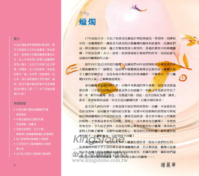 繼動手玩蠟燭.香皂之後,鍾老師再次結合沙蠟、香草及新的裝飾加工手法,創造出一物多用造型蠟,不僅可以營造居家、生活的樂趣,更不用再為送禮傷腦筋喔!全家人一起作蠟燭,趕快收集那些剩下的蠟燭,換下生日蛋糕上的數字蠟燭,讓手工蠟燭,點燃最歡樂的剩下。