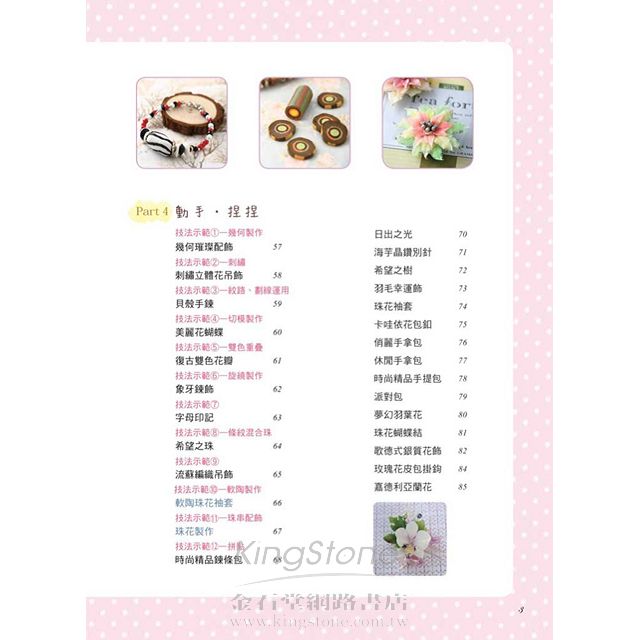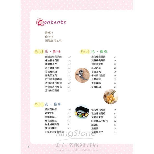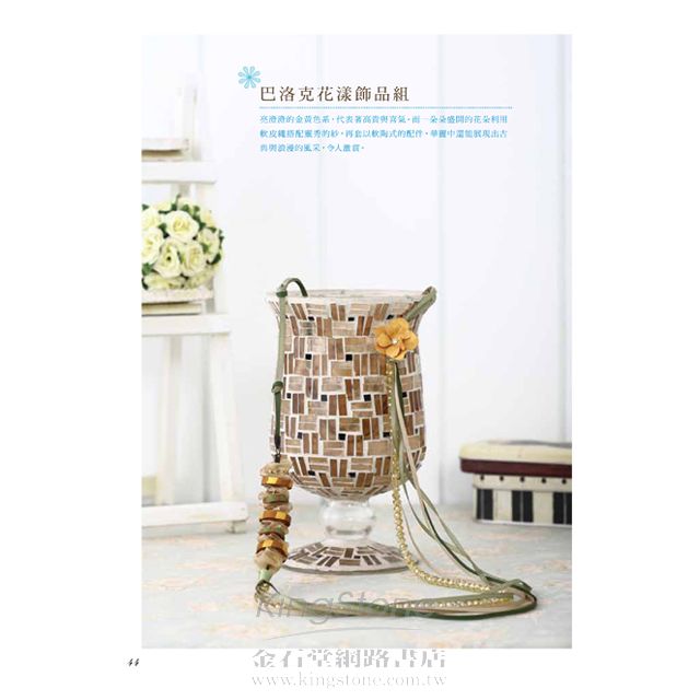 本書以隨手可得的工具、串珠配件及金屬扣環等素材,很輕鬆就能製做出各式的精緻小物,讓生活增添些許浪漫及多采多姿的氛圍。