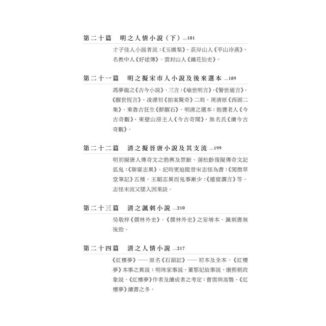 《紅樓夢》—原名《石頭記》—初本及全本。《紅樓夢》本事之異說:明珠家事說,董鄂妃故事說,康熙朝政象說。《紅樓夢》作者及續成者之考定:曹霑與高鶚。《紅樓夢》續書之多。