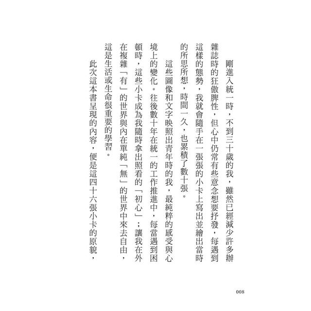 這些圖像和文字映照出青年時的我,最純粹的感受與心境上的變化。往後數十年在統一的工作推進中,每當遇到困頓時,這些小卡成為我隨時拿出照看的「初心」;讓我在外在複雜「有」的世界與內在單純「無」的世界中來去自由,這是生活或生命很重要的學習。