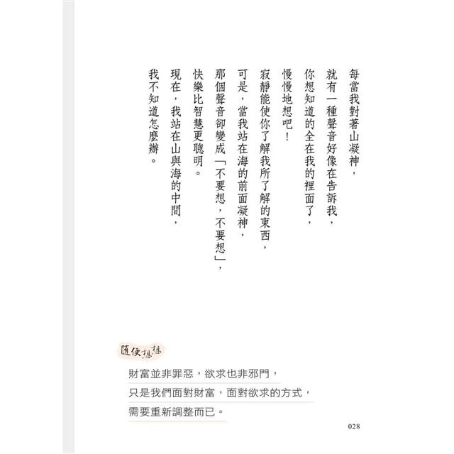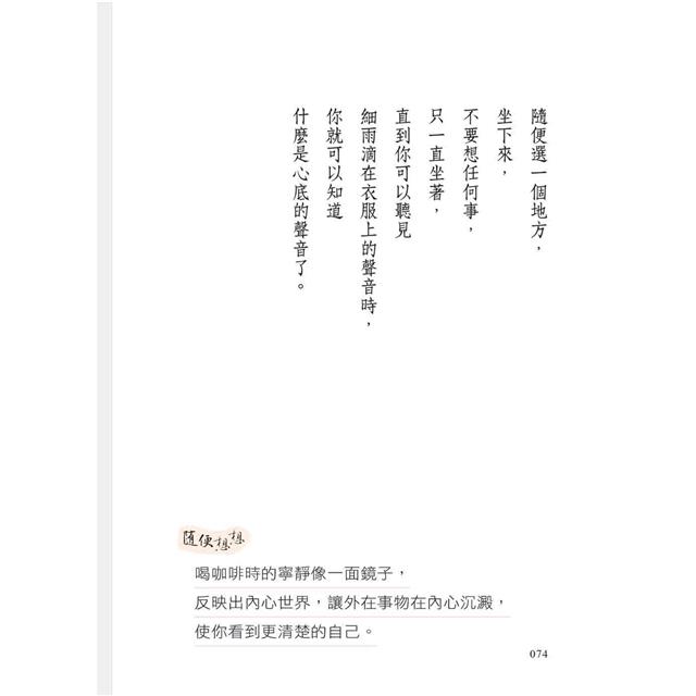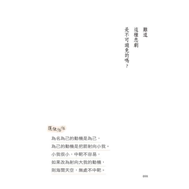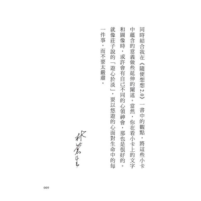 此次這本書呈現的內容,便是這四十六張小卡的原貌,同時結合我在《隨便想想2.0》一書中的觀點,將這些小卡中蘊含的意義做些延伸的闡述。當然,你在看小卡上的文字和圖像時,或許會有自己不同的心領神會,那也是很好的。就像莊子說的「遊心於淡」,要以悠遊的心面對生命中的每一件事,而不要太嚴肅。