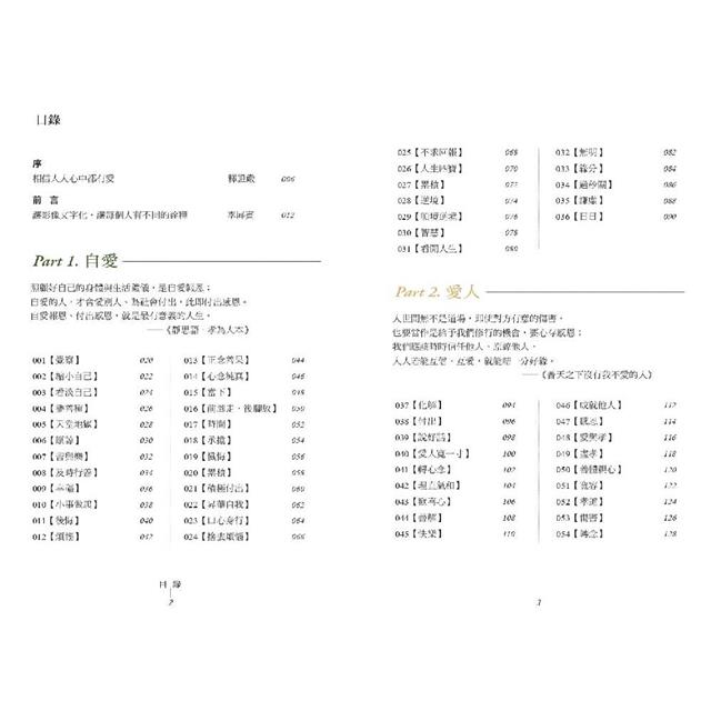 本書自證嚴上人智慧語錄《靜思語》中,精選100則中英對照、關於自愛、愛人、愛世間、愛眾生的心靈小語,每則心靈小語都有「光影詩人」李屏賓多年來隨手拍攝的作品。