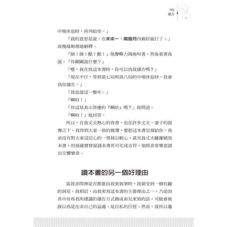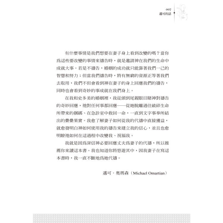 在本書,你會發現藉著禱告邀請神進入你的婚姻、並看到神垂聽你的禱告,是一件何等令人興奮及充滿盼望之事。
