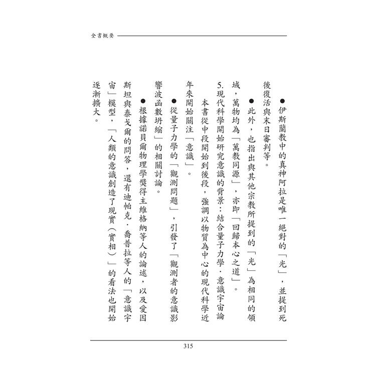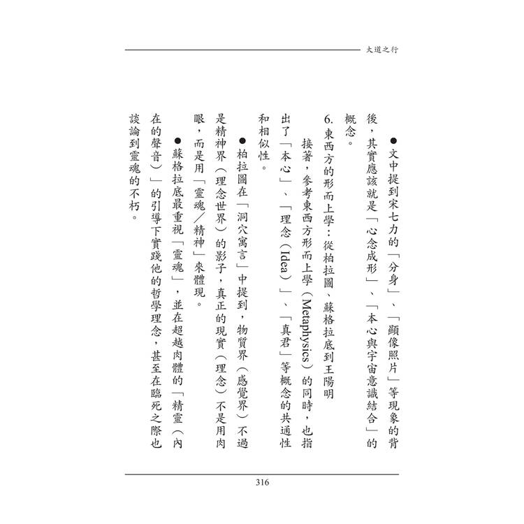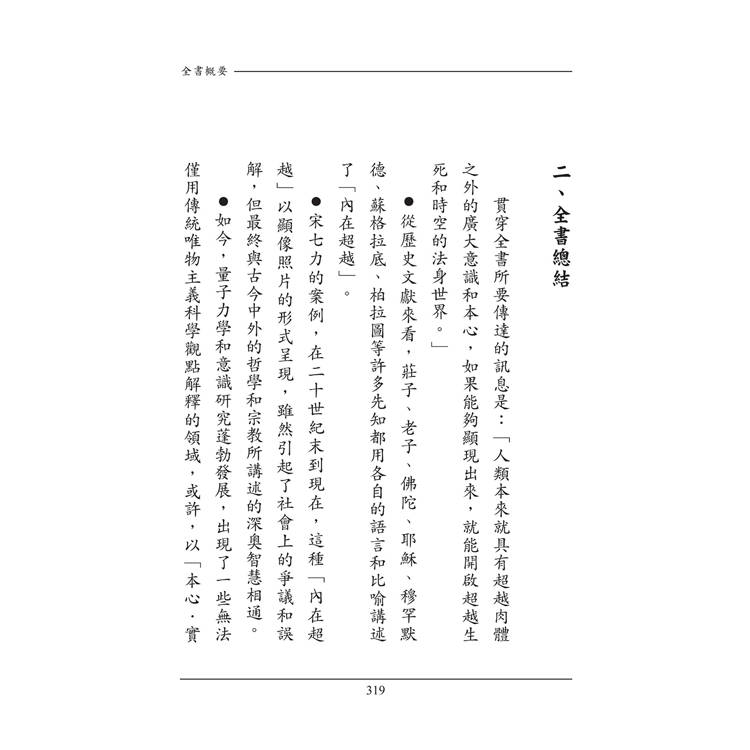 在本書中,作者特別從東方的老莊思想,到西方的蘇格拉底、柏拉圖的形上哲學,以及釋迦佛、耶穌等等人的思想和智慧𥚃,歸結出這些先知先覺者所講述的道理是有共通性或相似性的。他們都是用各自的語言和譬喻在講述有個「內在超越」(人類與生俱來的「內在本質」,是肉身之外的另一個存在)。而且,這個「內在超越」才真正與人類的成就佛道息息相關。