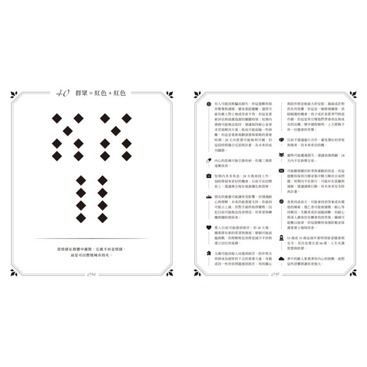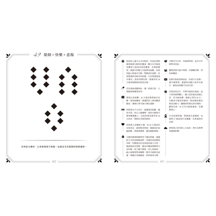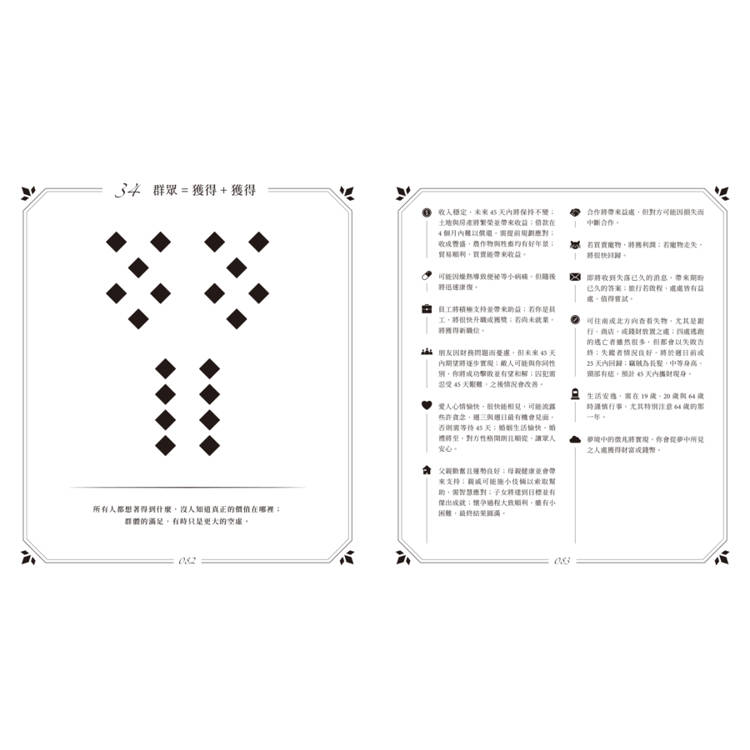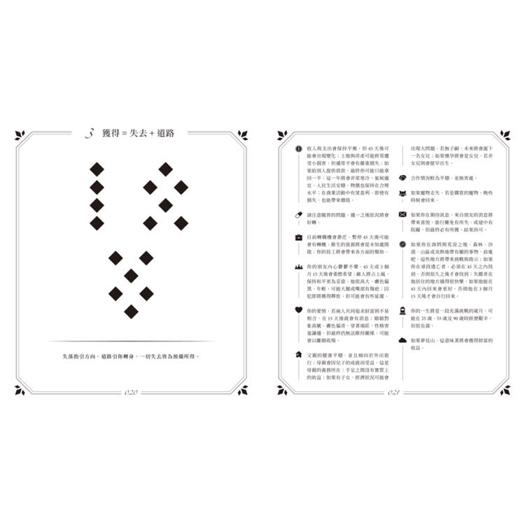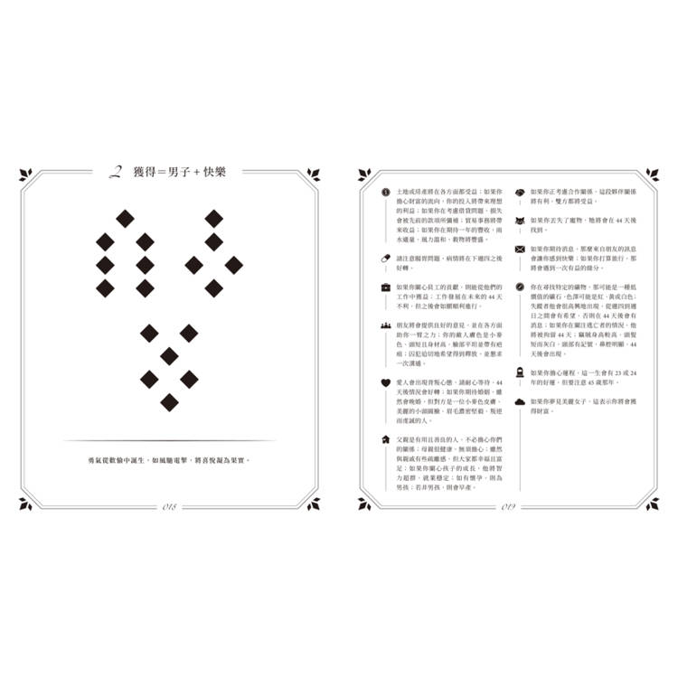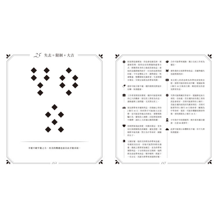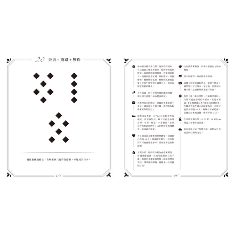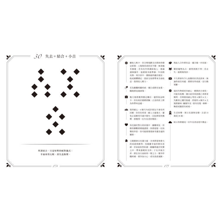 《地占解答之書》將古老的占卜智慧凝縮精練,再化為易讀的文字,協助我們在混亂的日常中找到方向。當情緒糾結、選擇分岔、或人生停滯之時,它像是一盞靜默的燈,照亮人們尚未察覺的可能性。透過簡易的占卜,讓古老的圖像智慧,成為生活中最踏實的指引吧!