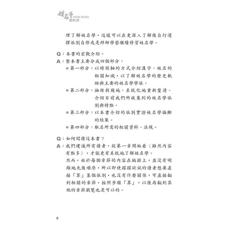 今特將《姓名學教科書》擴大改版成《姓名學教科書 暢銷六版》一書,以我三十年來的經驗,每年看超過三千個姓名,將各門各派加以分析整理,分門別類,是故有此一「集合了十一大派別」的姓名學,以供讀者們參考與研究。