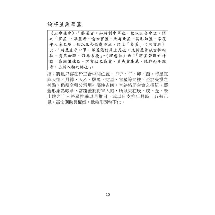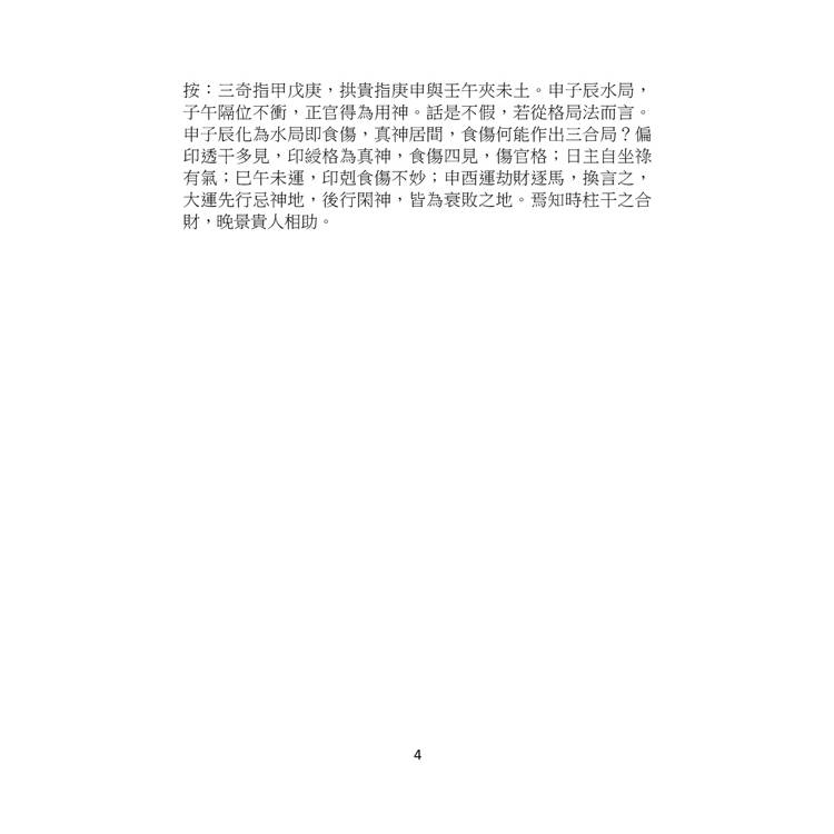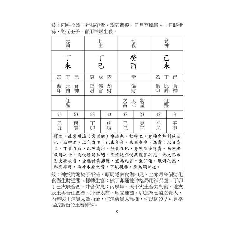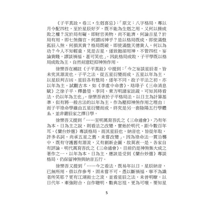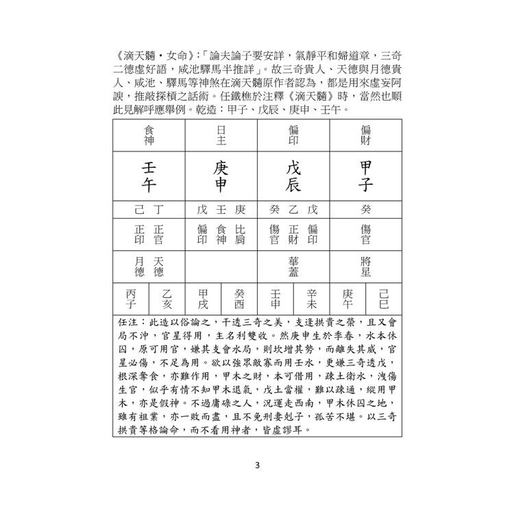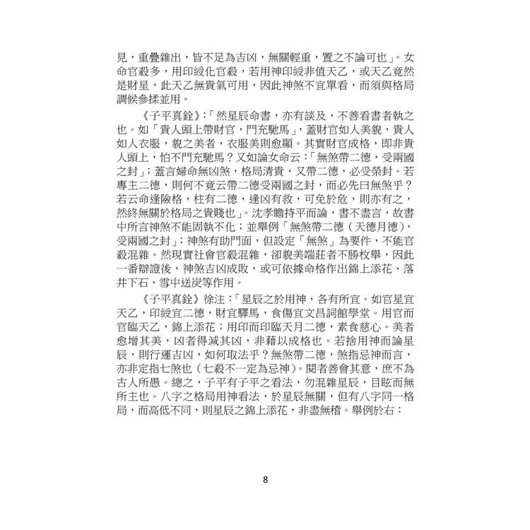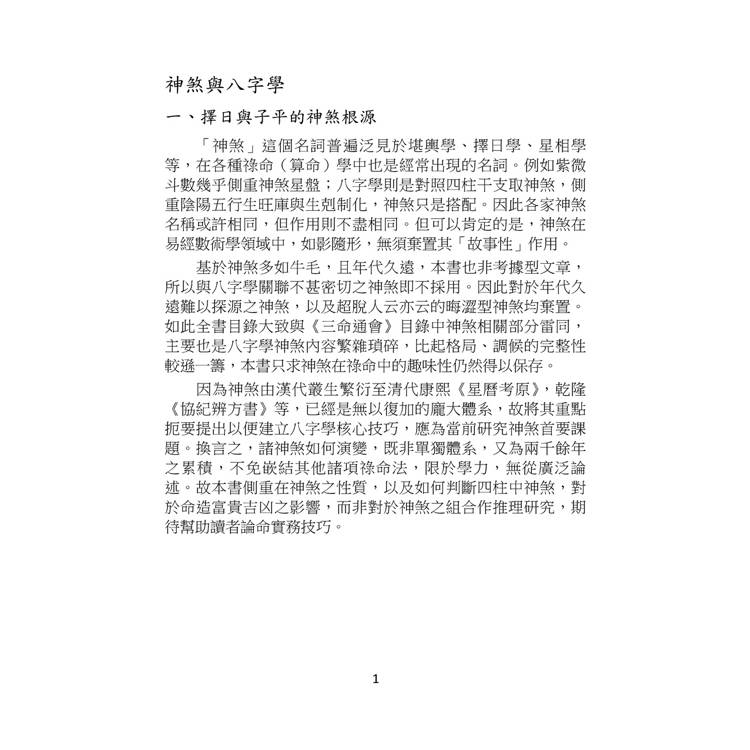 本書全面從將星、華蓋、咸池、三刑、驛馬、三奇、亡神劫煞、孤辰寡宿、小兒關煞、天乙天德月德文昌等貴人,如實論述,破譯古文晦澀之處,又加入古例與現代實例,將神煞、格局、調候、刑冲合會諸法合併論述,讀者仔細逐例參酌,自有收穫。