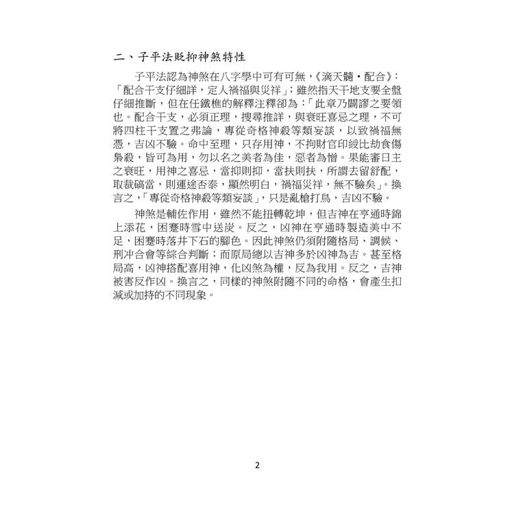 八字學畢竟是以四柱綜合的論命法,以神煞作為主流論命節奏,自然是削足適履,喧賓奪主;然而在一般家常形式的論命場合卻是必要的調味料,可以增加談話之間的趣味性。明代萬育吾氏之《三命通會》應該是目前集結神煞之扛鼎大作。本書不出左右,但以大量實例供讀者演練,足以自行歸納出神煞帝王條款,提高實務論命境界;不使讀者走馬觀花空讀本書。