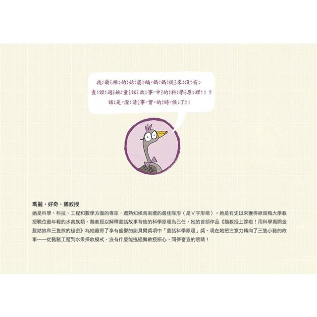 在這個充滿STEM元素的繪本系列中,作者便告訴我們:家喻戶曉的鵝媽媽說的童話故事,並不是基於科學!而這次要負責調查的人竟然是……鵝媽媽的姪女──鵝教授!她認為是時候揭露真相了。她將會對經典童話進行事實查核,並分析這些故事背後的科學缺陷──