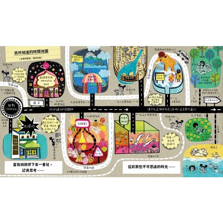 如此豐富、令人眼花撩亂的作品,讀的時候,可以先帶著孩子看看大標,確認自己現在在哪個時間序上,接著瀏覽一遍白底黑字的內文,跟著瑪莎的碎碎念,就能對這本書想要介紹給孩子的知識有個大概的輪廓,之後再細細品味繽紛多彩、饒富趣味的插畫,從中找出更多更豐富的知識內容。準備好了嗎?請親子一起來探索瑪莎的時間地圖,甚至更進一步,讓孩子畫出屬於自己的時間地圖吧!