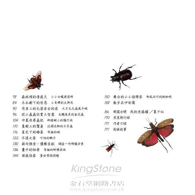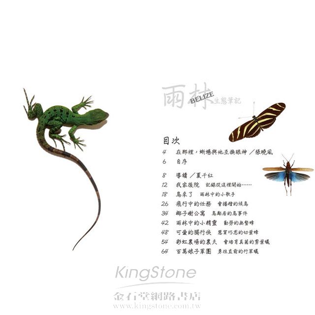 早先視寫作為恐怖夢魘的我,現在初嚐翱翔於文字天空的滋味,像是破繭羽化的蝴蝶,在此,我要感謝宇宙光的總幹事林治平林哥,給我機會在《宇宙光》雜誌上分享我的觀察心得,也要謝謝他的夫人名散文家曉風姐,在百忙中賜序,還有宇宙光文字部所有同仁,更謝謝多年的摯友千紅幫忙潤稿,是她帶我尋回寫作的信心與樂趣,謝謝內人淑卿幫我管理木工廠、身兼我的攝影助理,謝謝姪兒立謳在貝里斯時幫忙找蟲,充當攝影小助手,謝謝表弟林敬原在台灣幫忙選購攝影器材,資助珍貴的鏡頭,最後要謝謝台灣駐貝里斯的農業技術團技師鄭坤木先生,專攻農業病蟲害的他在工作之餘抽空為我檢視校訂,大大提升了本書的正確性。