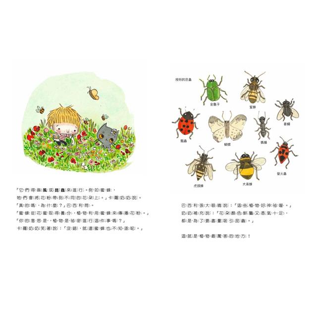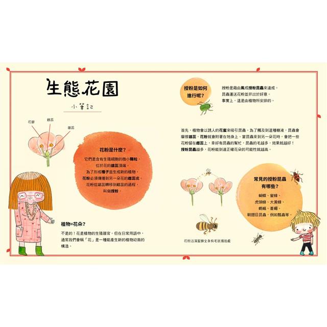 孩子常會關注周遭事物,並問大人「為什麼?」書中以童趣的畫風,透過祖孫互動問答,解答孩子的「為什麼?」書末更有「生態花園小筆記」說明植物如何進行授粉、花朵構造與常見的授粉昆蟲等概念。