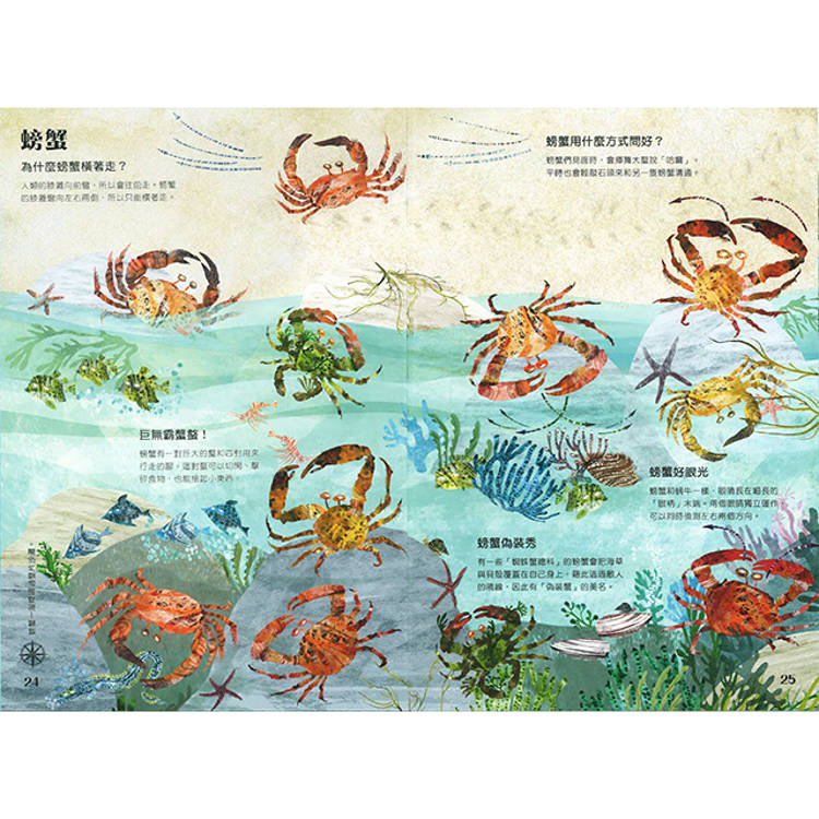 ․每個主題都由一個問句開始,幫助讀者釐清常見的疑問或誤解,例如:「鯊魚會吃人嗎?」、「螃蟹為什麼橫著走?」、「企鵝為什麼不會凍死?」……透過平易近人的文字與問答,滿足你的好奇心,親切的認識各種海洋生物!