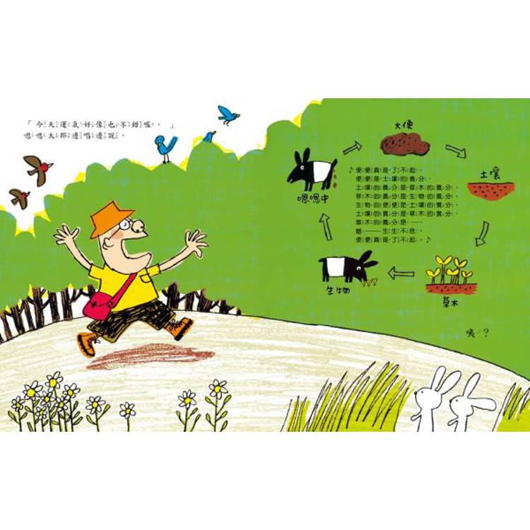 閱讀時,跟著幽默逗趣的主角嗯嗯太郎與不同的動物相遇、觀察牠們的便便和廁所,就能讓孩子邊閱讀邊簡單認識動物們與牠們的排便習性及生態。