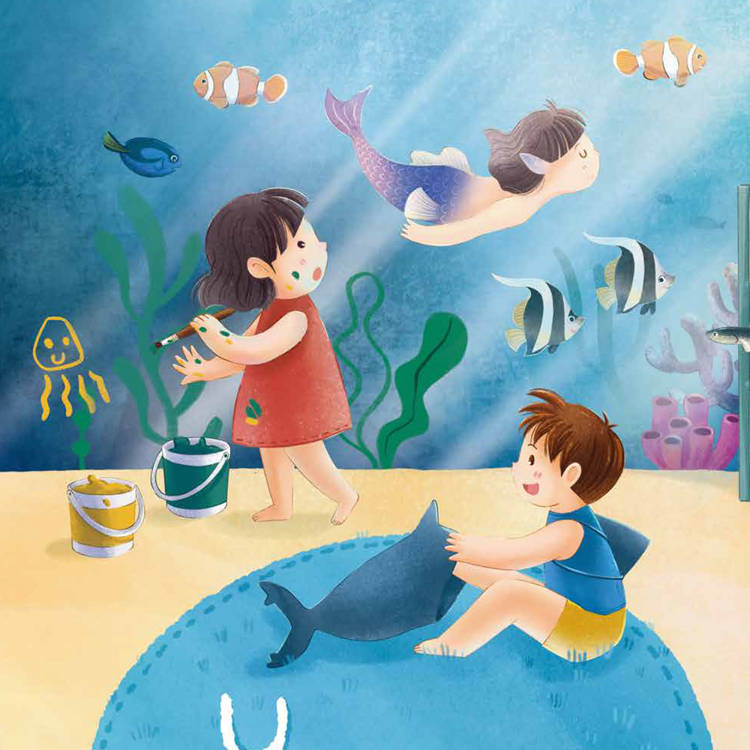 繪者記起小時候和姊姊常在房間裡玩各種假扮遊戲,有一次用被子當成海底世界,偷偷戴上媽媽的珍珠耳環、拿廚房用具做道具,甚至在臉上塗上爸爸的顏料,試圖把自己變成美人魚。即使裝扮不完美,但透過想像力將房間變成了一個充滿奇幻的海底世界。多年後仍然覺得那樣純真無憂的快樂氛圍是如此難忘和珍貴。許多人應該都有類似的經歷,繪者希望透過繪本畫面將這樣純粹的快樂和想像帶給更多的人。