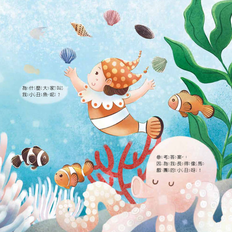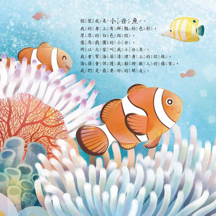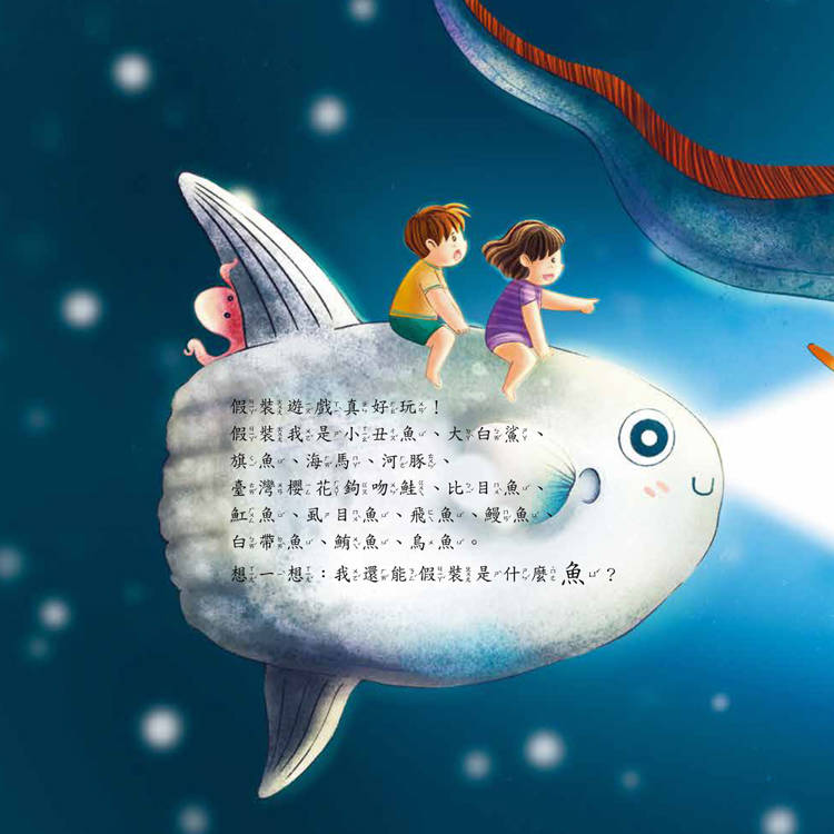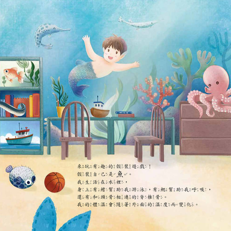透過繪本故事中的假扮魚類遊戲,讓孩子從趣味遊戲中來輕鬆學習,認識大自然的動物習性。