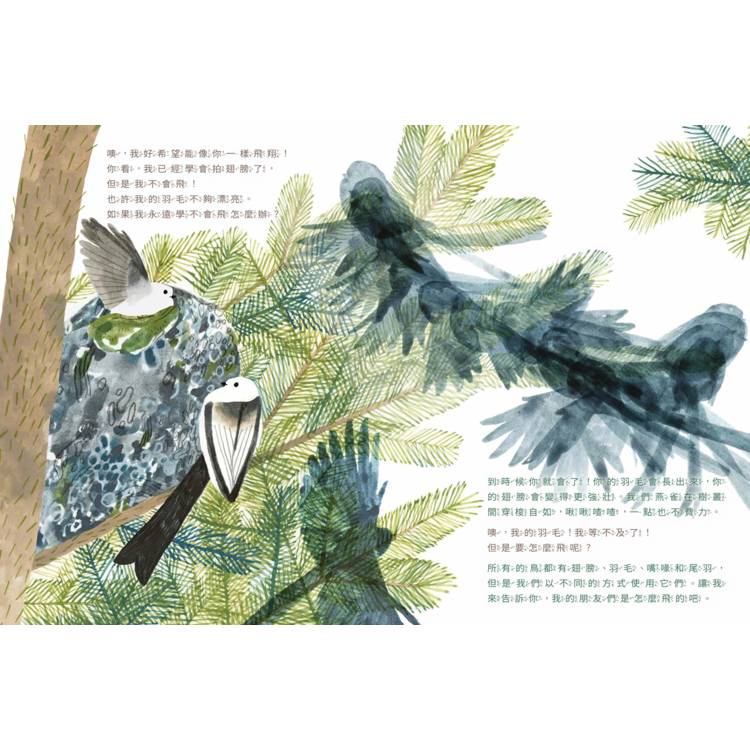 鳥朋友告訴他,當牠的羽毛愈漸豐美,翅膀愈漸強壯,就會飛了。鳥朋友還告訴牠,其他鳥兒是如何飛行的。像是: