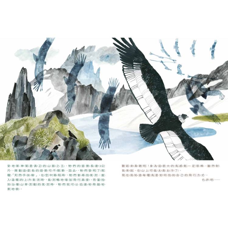 抬頭仰望天空,常常能見到各種鳥類展翅飛翔、滑翔或翻騰,各有特色。《我也想像鳥一樣飛》這本童書繪本,便是以這些鳥類多樣的飛行方式為主題,向讀者介紹天空中的舞者。