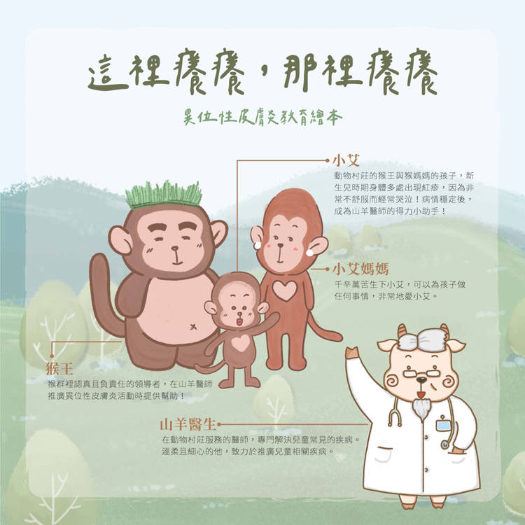 「讓每一個家長都能夠認識異位性皮膚炎」是筆者身為一個兒童過敏專科醫師責無旁貸的使命,這些年來不斷透過網路、臉書社團與粉絲團、超過百場的衛教宣導演講、報章媒體、雜誌、出版書籍……來推廣異膚。但是總覺得還有些可以努力的地方,因此腦中浮現親子共讀兒童繪本的構想,簡單易懂科普文字來介紹異膚相關資訊,讓家長瞭解醫療常識也可以正確回答孩子在繪本中所遇到的疑問。醫療科普內容包含疾病介紹、如何診斷、標準治療、飲食與皮膚保溼注意事項,提供家長實用的資訊。繪本的故事內容由麗文文化事業機構蔡博文與林敏怡藉由親自訪談多位異膚的家長所構思而成,再與藝術家張椀晴(阿布布思義/阿布)討論每一情節之繪圖,自己也正努力抵抗病魔的阿布,一心仍然掛念著如何造福他人,繼合作出版《天使的禮物:兒童特發性關節炎-教育繪本》與《小薇不見了:川崎症-教育繪本》得到廣大的迴響,今年團隊再度聯手造福更多異膚的孩子與家長。