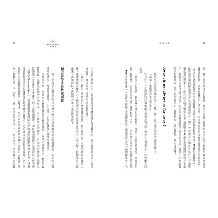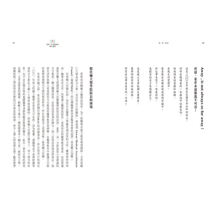 這是我從台北醫學大學借調到輔仁大學醫學院當院長的六年(二○○二〜二○○八年)故事,輔仁大學透過醫院籌備處經營管理輔大診所,擴大成十三個專科,提供全校教職員工、神職人員和社區居民的醫療照顧,並經常需要執行社區醫療服務,為未來的輔大醫院整體形象宣傳行銷。