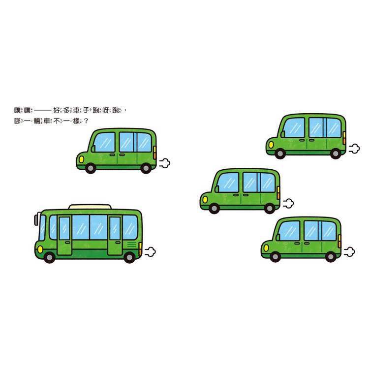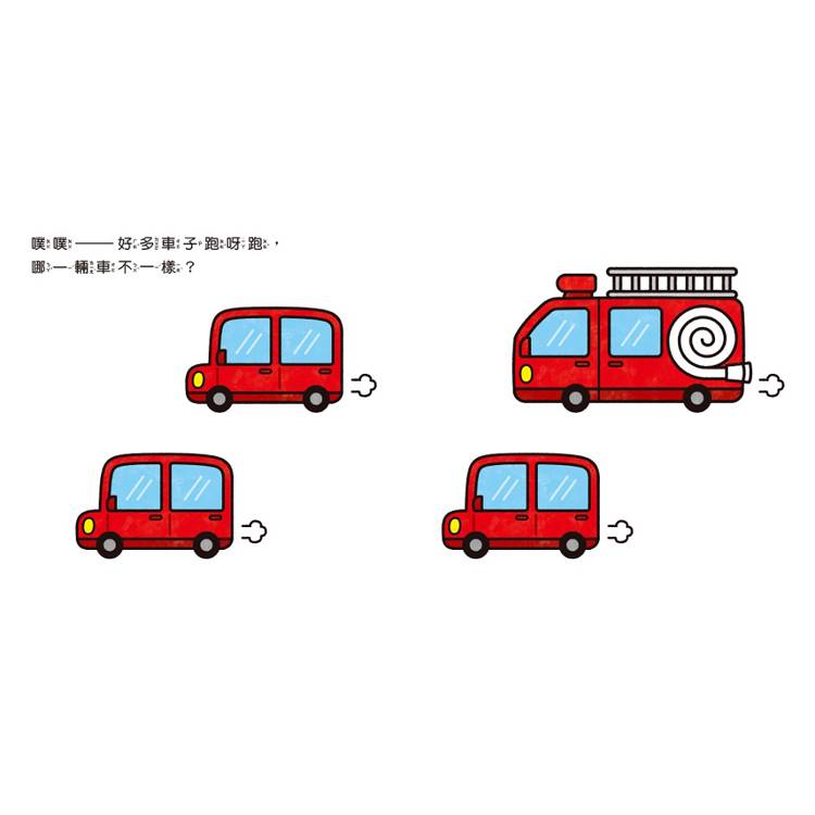 這本可愛的工作車繪本以跨頁形式呈現問題與答案,先引導孩子從多輛車的頁面中指出「哪一輛車不一樣?」,比較它們的相異之處,翻頁後便是該輛車的車種名稱、功能、聲音和工作情境。
