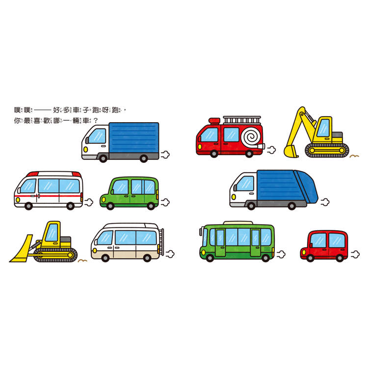 看似簡單的繪本,蘊藏多種玩法與互動方式,更能結合日常生活中的真實體驗,快來透過這本書和孩子一起認識路上跑來跑去的車子,享受親子對話與遊戲的共讀時光吧!