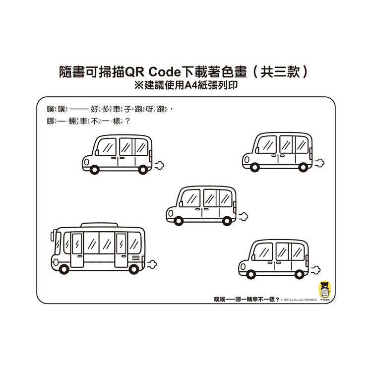看完這本繪本,不妨和孩子一起觀察日常中實際出現的車子,或者透過版權頁上的QR Code下載著色畫,比較看看圖像與真實車輛又有哪裡不一樣,增加生活樂趣的同時,也能感受到孩子成長的變化喔!