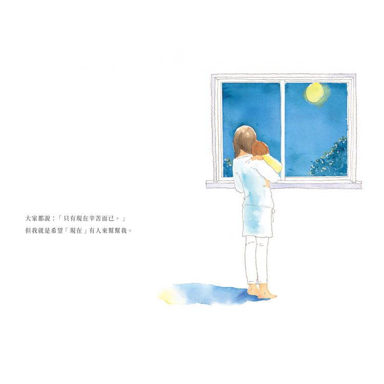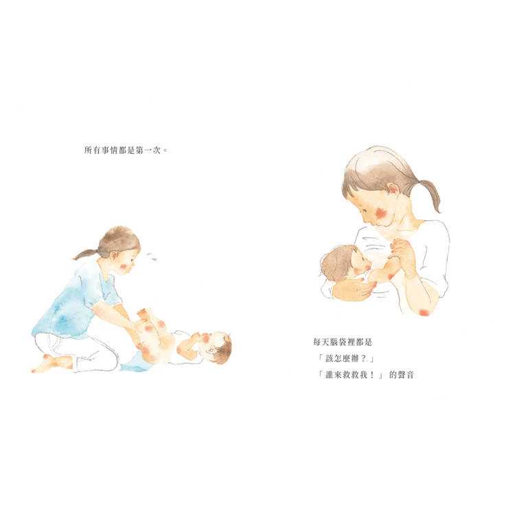 因為所有事情都是第一次,故事裡的媽媽腦海中總是不斷播著「該怎麼辦?」的焦慮。當身旁的人安慰「只有現在辛苦而已」時,媽媽內心最真實的吶喊卻是:「我只希望『現在』有人能來幫幫我。」