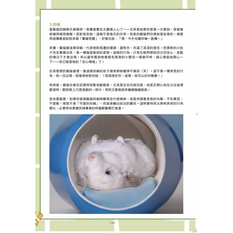值得特別一提的是,本書能以中文與讀者見面,並非偶然,而是出自台灣龍貓社群中幾位熱心推廣者的共同努力。悠悠龍貓咖啡的帥小姐、甜蜜龍貓屋的陳小姐,以及 喆的動物園 寵物溝通師 簡立喆,她們不僅推動了本書的翻譯與出版,更是台灣在地的飼養與繁育者,長年投入於龍貓文化的推廣與飼主社群的經營。她們讓這本書的出版不再只是單純的知識傳遞,更代表著台灣飼養文化逐步邁向專業化的實踐。