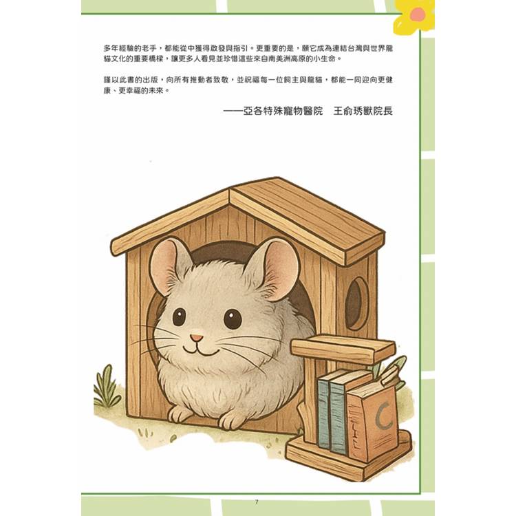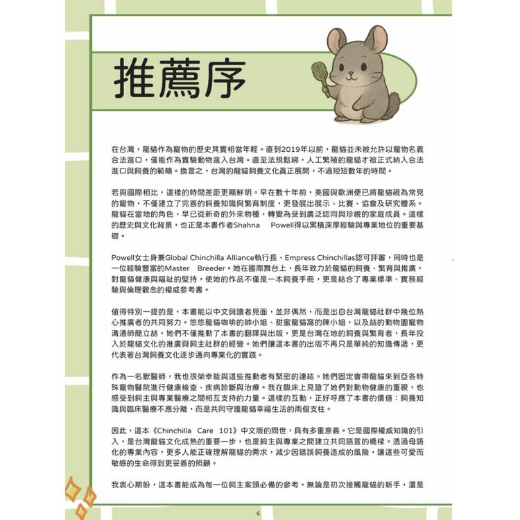 我衷心期盼,這本書能成為每一位飼主案頭必備的參考,無論是初次接觸龍貓的新手,還是多年經驗的老手,都能從中獲得啟發與指引。更重要的是,願它成為連結台灣與世界龍貓文化的重要橋樑,讓更多人看見並珍惜這些來自南美洲高原的小生命。