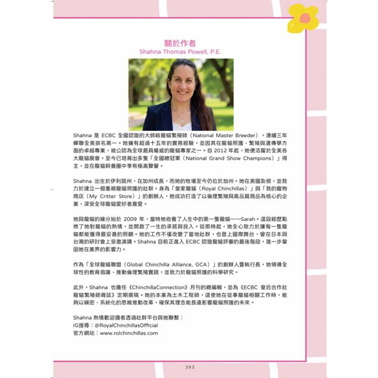 Powell 女士身兼 Global Chinchilla Alliance 執行長、Empress Chinchillas 認可評審,同時也是一位經驗豐富的 Master Breeder。她在國際舞台上,長年致力於龍貓的飼養、繁育與推廣,對龍貓健康與福祉的堅持,使她的作品不僅是一本飼養手冊,更是結合了專業標準、實務經驗與倫理觀念的權威參考書。