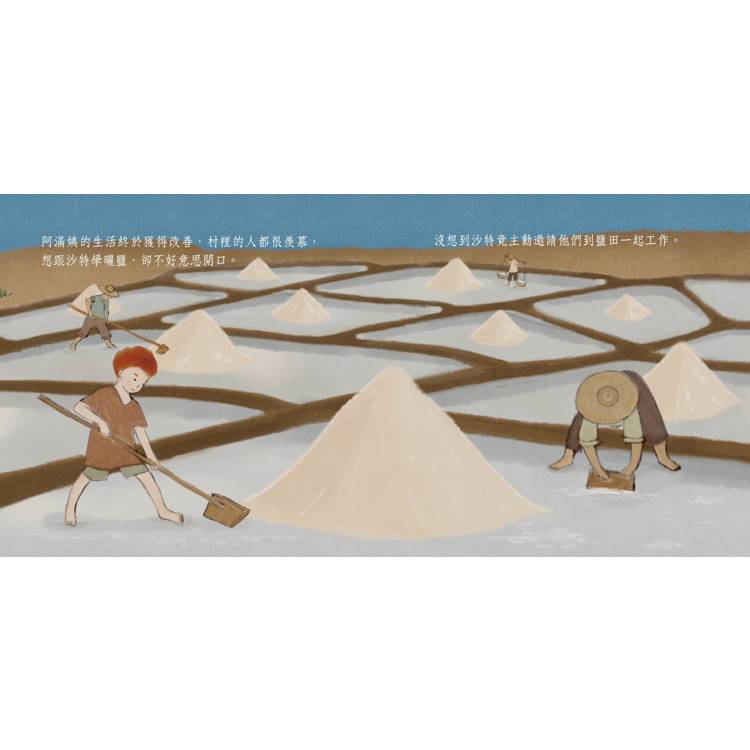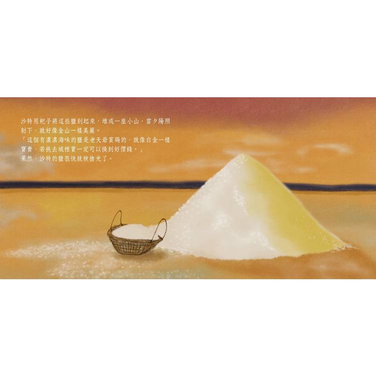 這本繪本的出版目的,是希望透過生動有趣的故事,搭配精美的圖畫,吸引大家對天然日曬鹽的重視。雖然故事為新創虛構,卻也藉此告訴讀者,台灣早在荷治時期就開始在日曬充足的西南部海邊,用天然的日曬方式,從乾淨的海水中獲得珍貴的鹽。現在雖然因為種種原因,使得需要大量人力的天日鹽產量減少了,但是,這個攸關人體健康的鹽產業文化還是需要更多人來了解關注及推廣,所以,請大家好好吃好鹽吧!