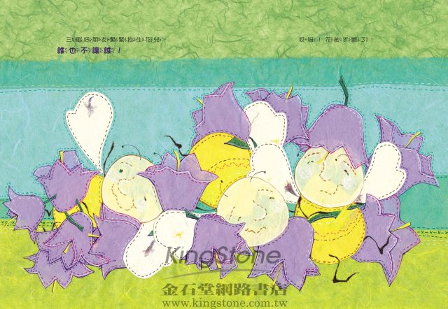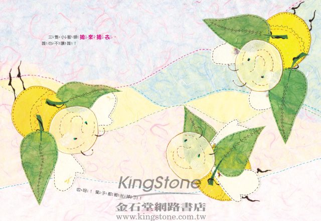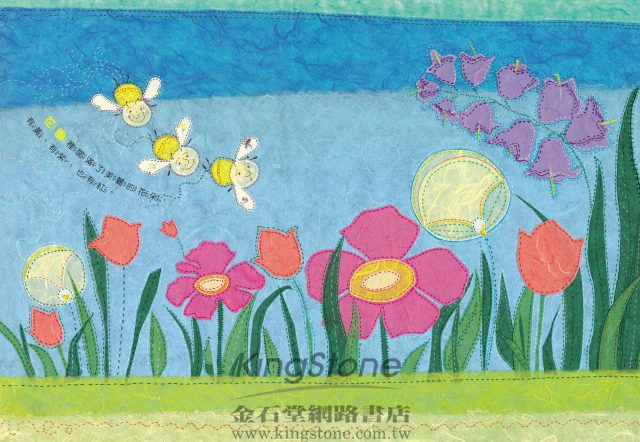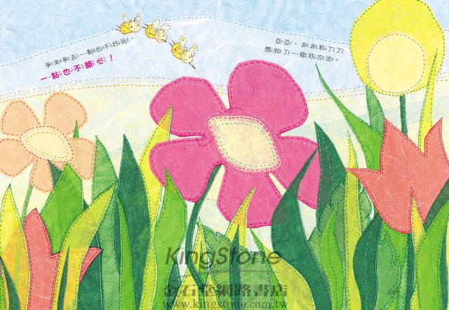 故事中擬人化的三隻小蜜蜂從相處的經驗中學會分享,藉著故事我們可以讓孩子了解到因為分享,反而能擁有更多無形的價值。書中特殊的表現法是採用顏色柔和的雲龍紙,透過形狀的剪裁與重疊拼貼構成圖案,並在圖案的邊緣,手繪了縫線般的線條,讓人產生拼布溫柔觸覺感受的聯想,斷斷續續的線條帶來視覺的流動感,讓我們彷彿看到風的路線,構築出三隻小蜜蜂的春天世界。