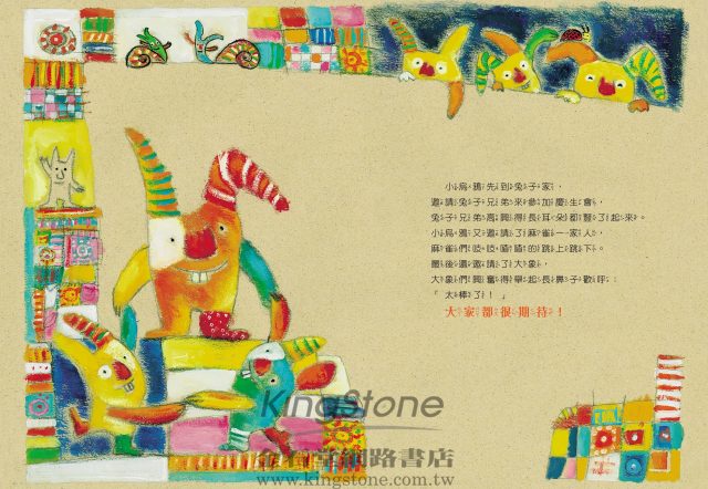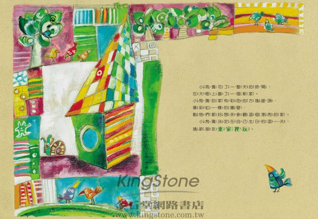 這是一個充滿童心童趣的故事,不時還會讓人莞爾一笑。故事中小烏鴉想和森林裡的動物們當好鄰居,努力的清掃房子、準備食物,邀請大家來參加慶生會,可是等到客人都到了,才發現大象和兔子沒辦法到小烏鴉在樹上的家裡,而預先準備好的食物也只適合自己吃。學齡前幼兒的思考風格就是這樣,完全從自己的角度來思考別人的需要,或者事前無法思考周延,必須要根據事後的結果,才可能發現自己當初的不足或不當之處。本書畫面充滿幾何的構圖與亮麗的色彩,以不透明水彩做出狀似蠟筆的筆觸,就像孩子自己畫的一樣;擬人化逗趣可愛的動物造型,展現出特殊的魅力。其獨特的構圖方法,突破一般透視的法則,將所有事件巧妙的呈現在同一個平面上,在閱讀時忍不住會仔細端詳研究,越看越有趣味呢!