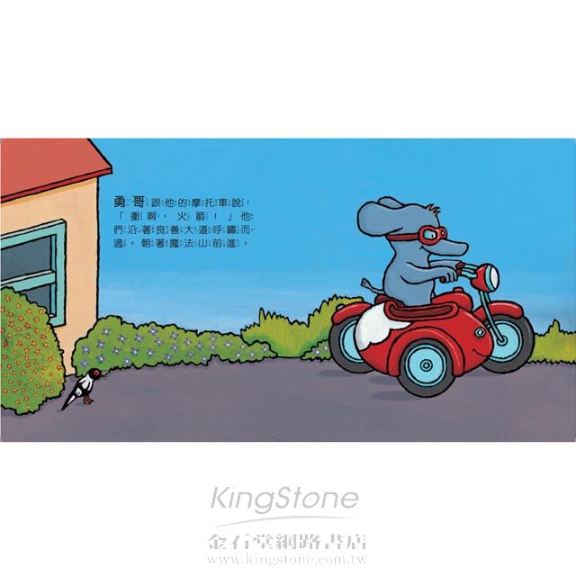 勇哥跟他的摩托車說:「衝啊,火箭!」勇哥揮揮手跟他的朋友們打招呼,然後就朝著魔法山前進,他從山頂上看到整個鄉間的風景。這時候,突然一聲轟隆巨響,地面也開始震動了,石頭都滾落到橋面上,勇哥的朋友們正好要過橋。勇哥要趕快去救他們才行!